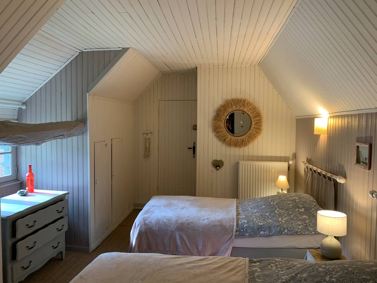 Two-story traditional Norman house Ground floor: cozy living room with fireplace, 65" TV with soundbar, dining room, separate equipped kitchen, bathroom with shower First floor: two bedrooms (1 king size bed, 2 single beds) Outside: private garden and terrace with garden furniture, BBQ, ping-pong table and table football Perfect for families or groups of 4 people Private parking with electric car charging station
